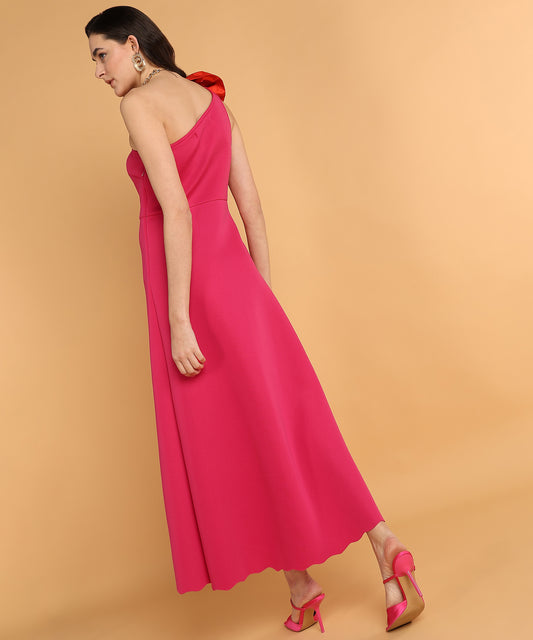 Hot Pink One Shoulder A-Line Midi Dress with Statement Bow for Women