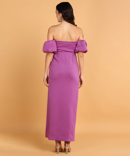 Purple Off Shoulder Puff Sleeve Slit Maxi Dress for Women