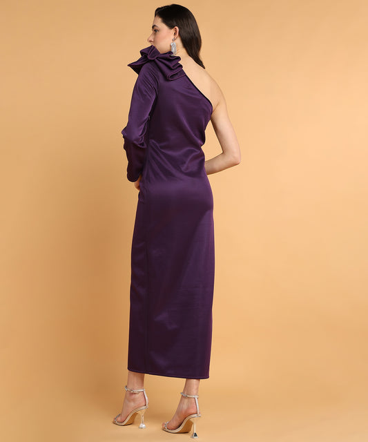 Purple One Shoulder Satin Bodycon Midi Dress with Dramatic Bow Sleeve for Women