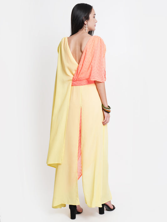 Yellow and Coral Colorblock Wrap Maxi Dress for Women | Slit Style Party Gown