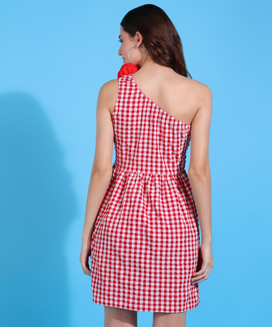 Women’s Red White Check One Shoulder Mini Dress with Floral Detail
