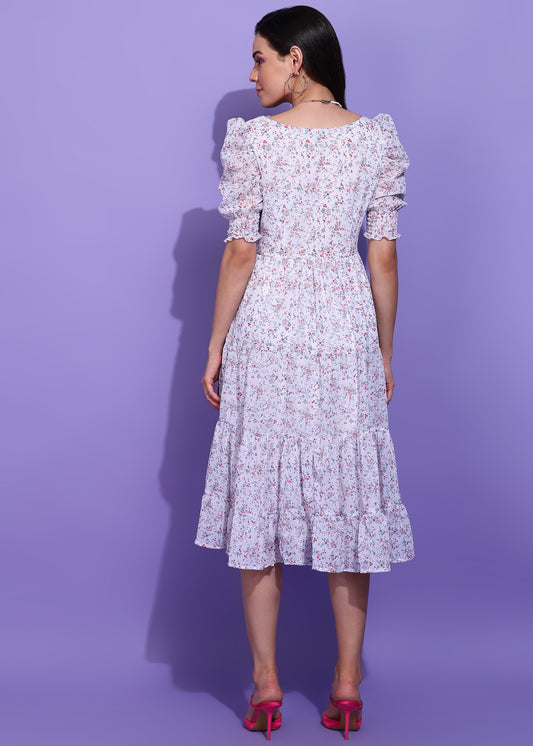 Women’s White Floral Puff Sleeve Tiered Midi Dress