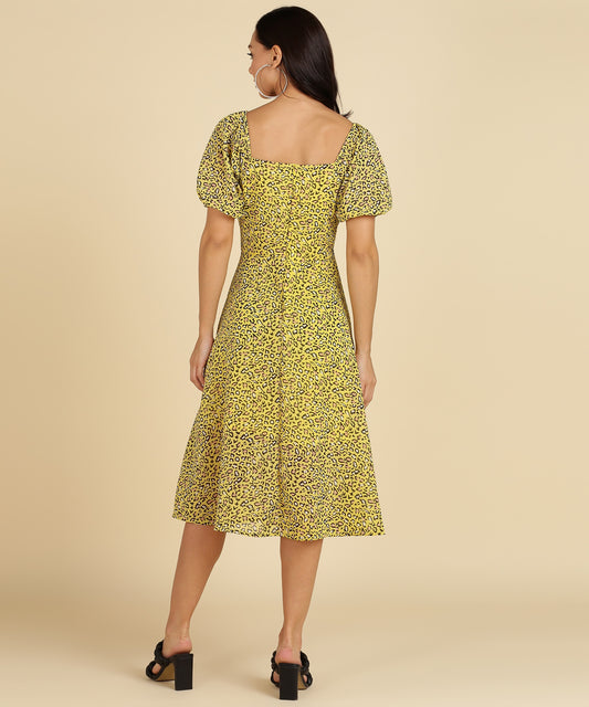 Yellow Floral Cut-Out Midi Dress with Puff Sleeves – Trendy Summer Dress for Women