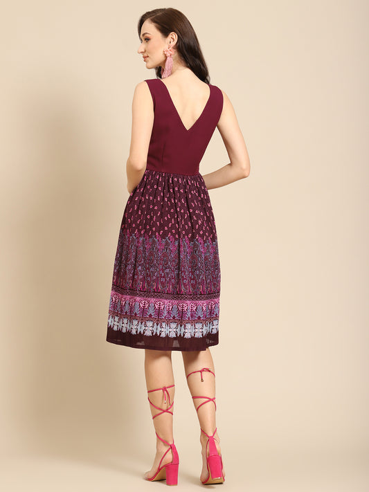 Women’s Sleeveless Maroon Printed Midi Dress – Stylish V-Neck Party Wear
