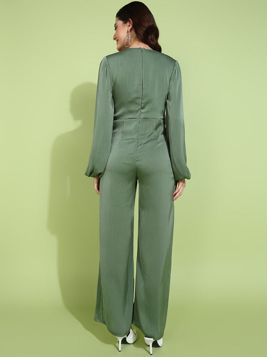 Chic Olive Green Pleated Jumpsuit with Belted Waist and Long Sleeves for Women