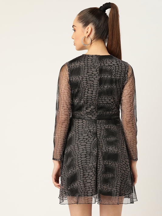 Chic Black Mesh Fit & Flare Mini Dress for Women – Long Sleeve Party & Evening Wear