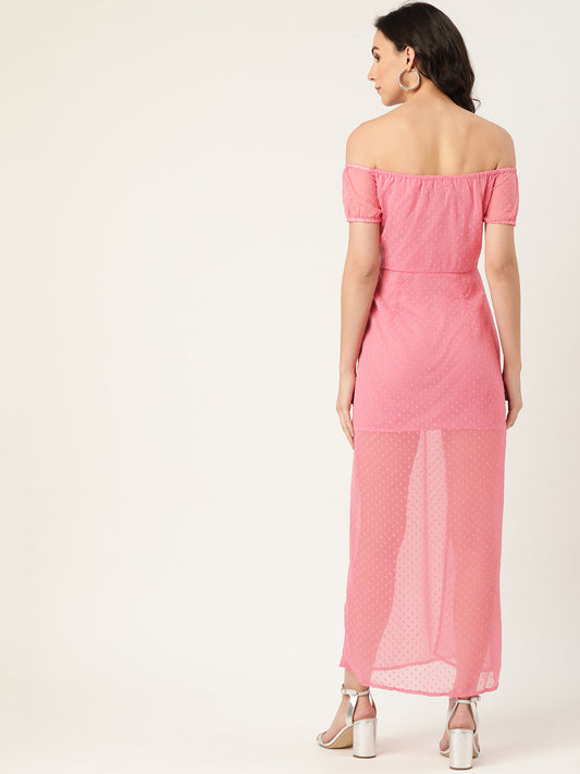 Chic Pink Off-Shoulder Maxi Dress for Women – Sheer Slit Party Wear Summer Outfit
