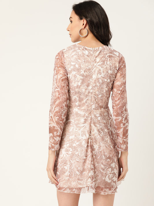 Elegant Pink Floral Mesh A-Line Mini Dress for Women – Long Sleeve Party Wear