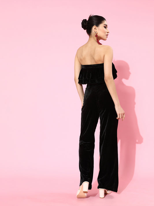 Chic Black Velvet Strapless Jumpsuit with Ruffled Detail – Fashion-Forward & Trendy