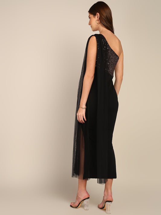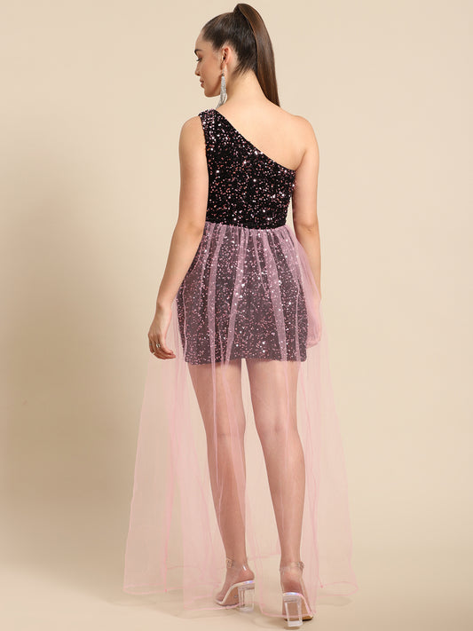 Stylish One Shoulder Sequin Black and Pink Net Dress for Women | Party Wear Gown
