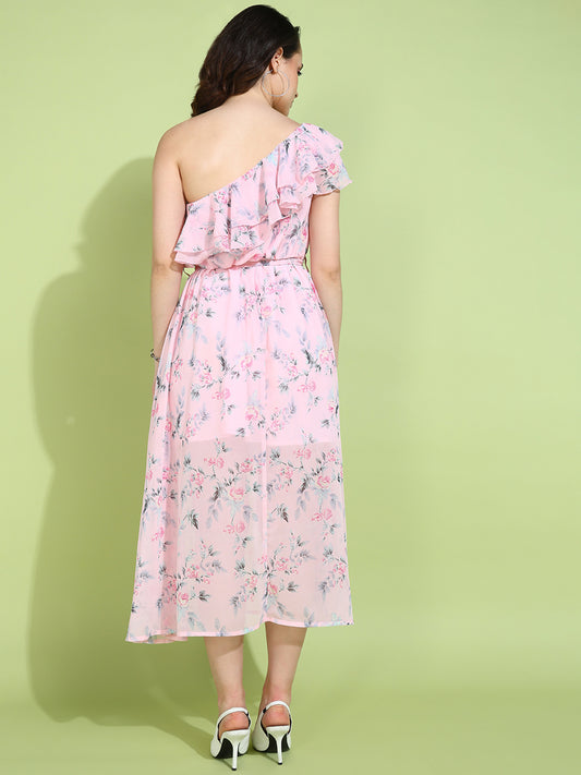 Pink One Shoulder Floral Ruffle Midi Dress for Women | Elegant Summer Dress