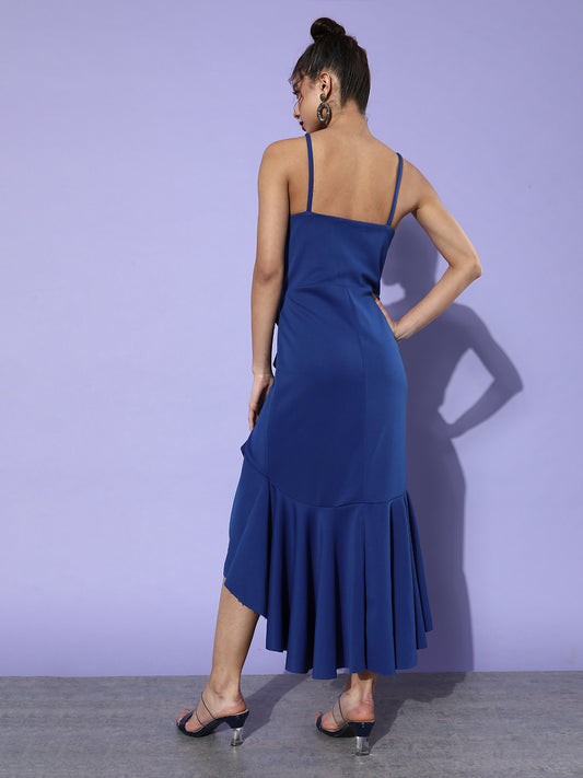 Royal Blue One-Shoulder Ruffle Midi Dress with Asymmetrical Hem for Women