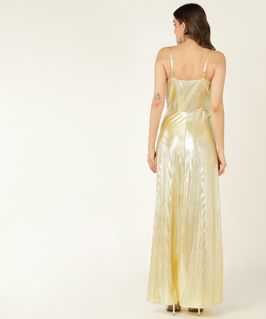 Elegant Gold Metallic Pleated Dress with V-Neck and Spaghetti Straps