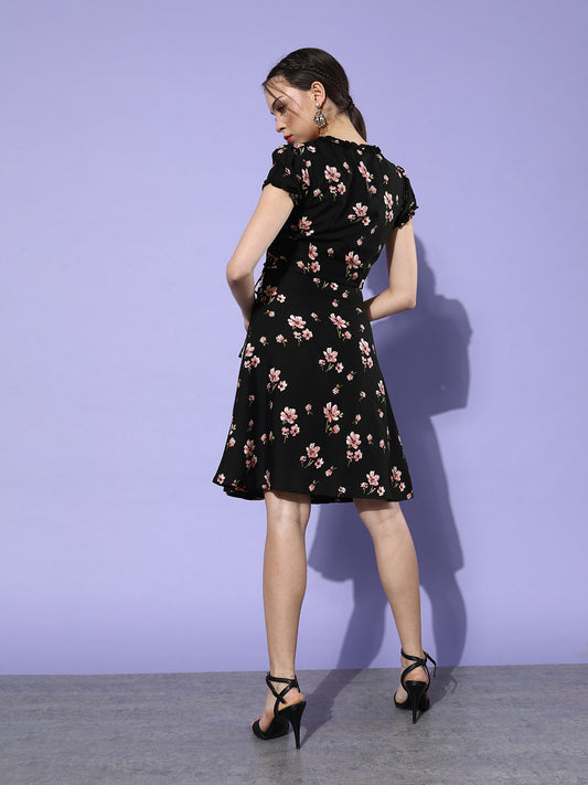 Black Floral Wrap Dress Elegant Puff Sleeve A-Line for Day & Night