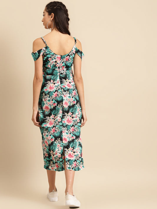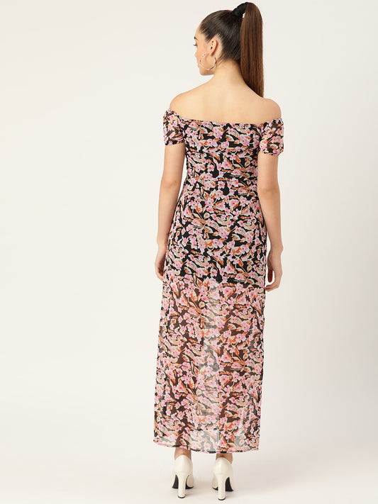 Off Shoulder Black Floral Print Slit Maxi Dress for Women