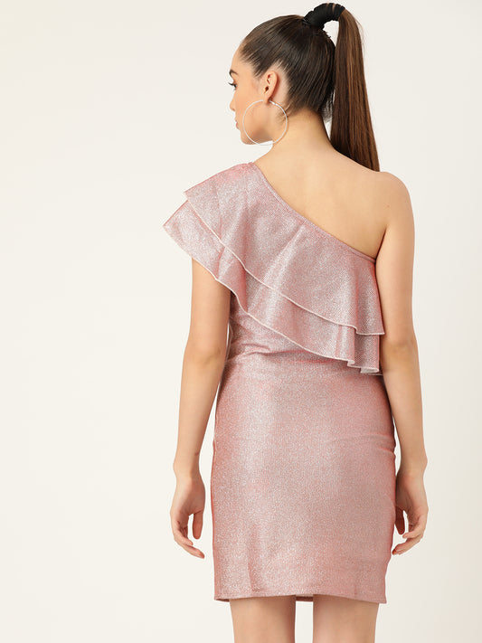 Women Pink One Shoulder Ruffle Party Dress with Shimmer Finish