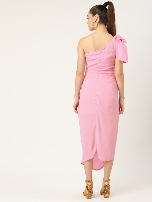 Women Pink One Shoulder Bow Detail Draped Midi Dress
