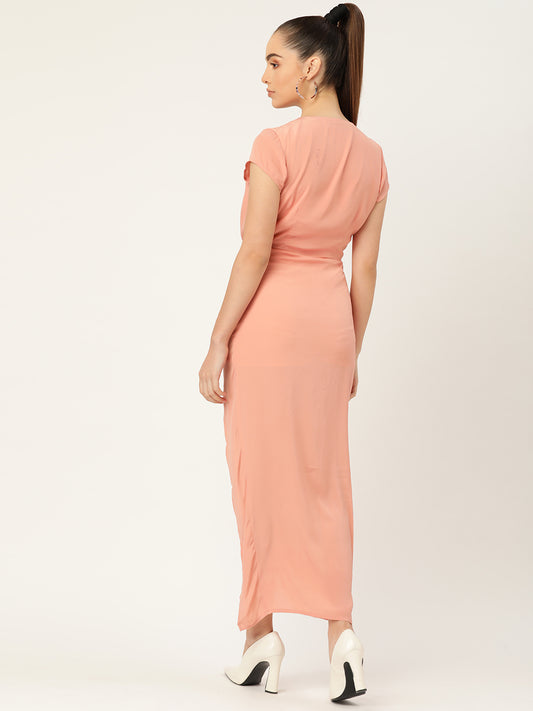 Women Peach Wrap Maxi Dress with Ruched Detail and High Slit