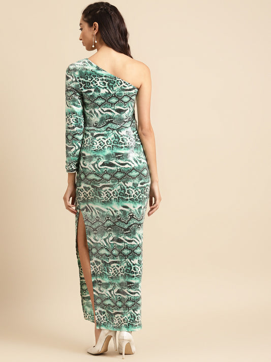 Women Green Animal Print One Shoulder Bodycon Maxi Dress