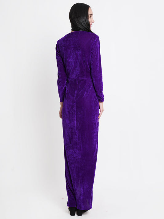 Purple Velvet Thigh High Slit Evening Gown for Women | Full Sleeve Party Dress