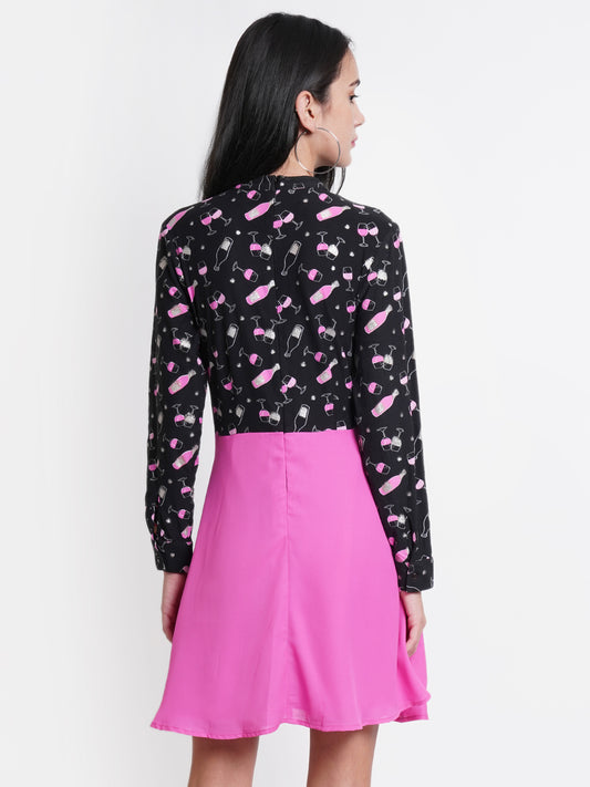 Pink and Black Printed A-Line Dress for Women | Long Sleeve Casual Fit & Flare Dress