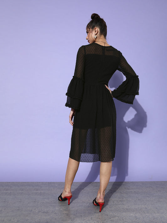 Women's Black Textured Midi Dress with Sheer Bell Sleeves Elegant Party Wear