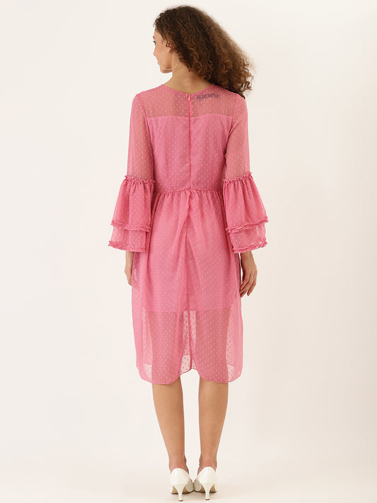 Pink Sheer Polka Dot Midi Dress for Women – Flared Sleeves & Layered Mesh Design