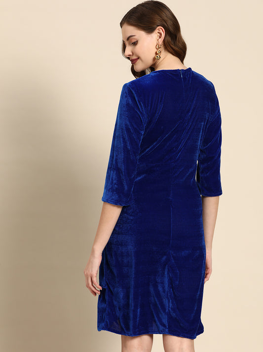 Royal Blue Velvet Wrap Dress for Women – Elegant Party Wear with V-Neck & Asymmetric Hem