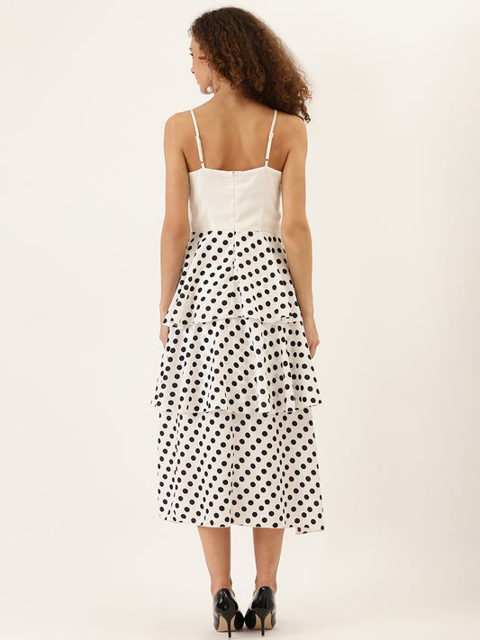 Women's White Spaghetti Strap Tiered Midi Dress with Black Polka Dots Stylish Layered Design