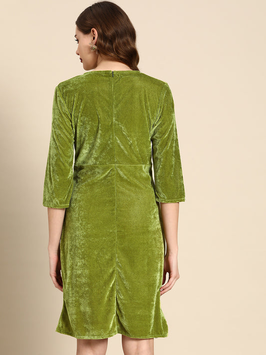 Elegant Green Velvet Wrap Dress for Women – Party Wear Dress with 3/4 Sleeves & Asymmetric Hem