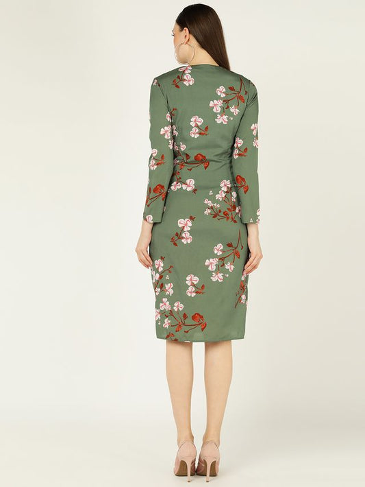 Green Floral Bodycon Dress with Square Neck & Side Slit