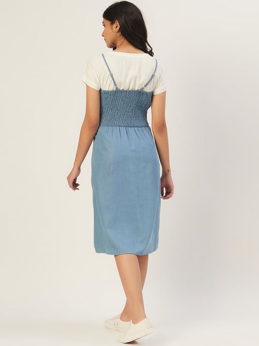 Blue Denim Pinafore Dress with White T-Shirt for Women – Casual Layered Midi Dress