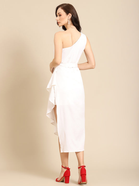 Elegant White One-Shoulder Asymmetric Dress for Women | Belted Party Dress
