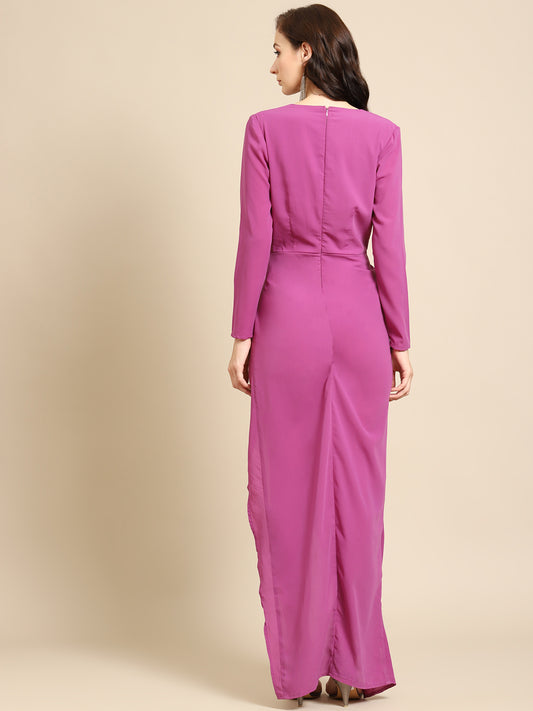 Elegant Magenta Wrap Style Long Slit Evening Dress for Women