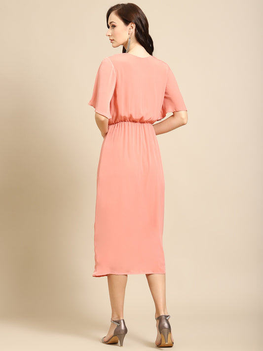 Elegant Peach Midi Dress for Women | Stylish V-Neck Tie-Waist Dress