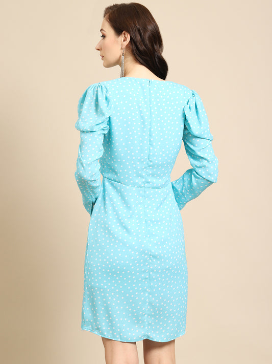 Sky Blue Polka Dot Bodycon Dress for Women | V-Neck Long Sleeve Ruched Dress