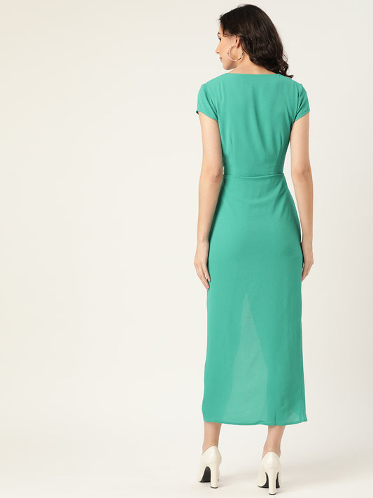 Elegant Green Ruched Wrap Midi Dress for Women – V-Neck Slit Dress for Casual & Party Wear