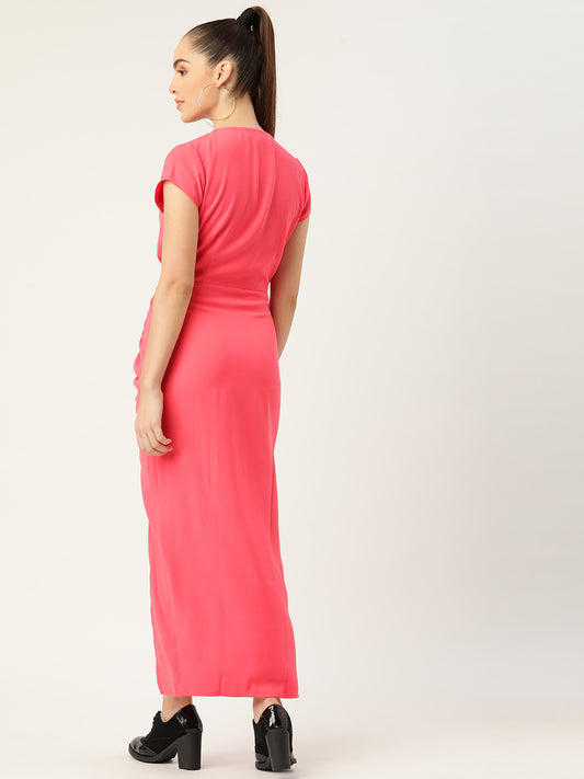 Coral Pink Ruched Wrap Midi Dress for Women – V-Neck Slit Dress for Party & Casual Wear