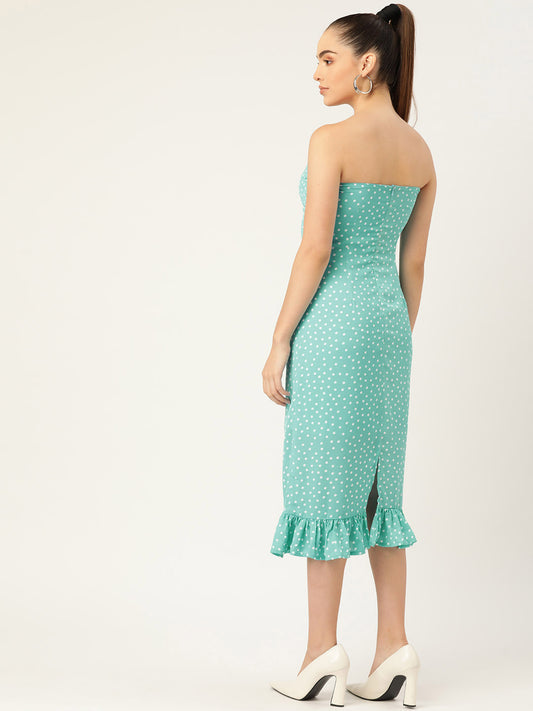 Elegant Mint Green Polka Dot Strapless Midi Dress with Ruffle Hem