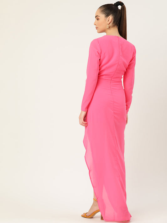 Elegant Pink Wrap Maxi Dress with Long Sleeves and Side Slit for Women