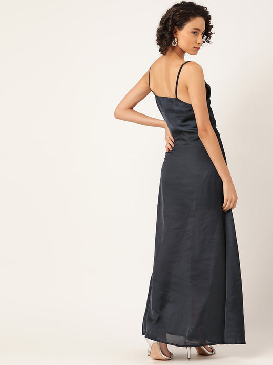 Elegant Black Satin Maxi Dress with Spaghetti Straps for Women