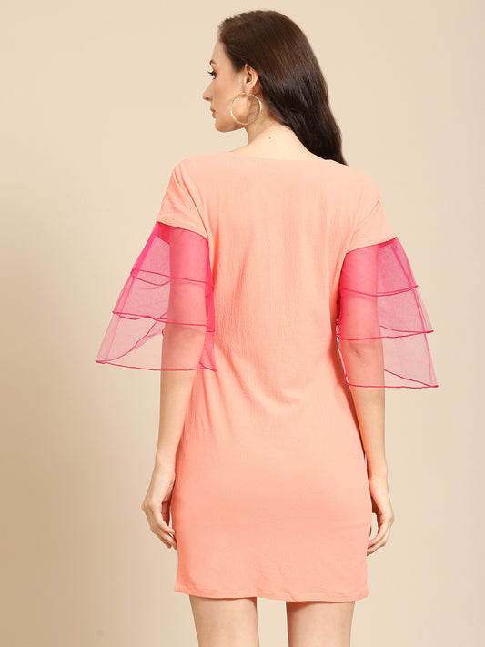 Peach Mini Dress with Pink Organza Ruffle Sleeves – Elegant & Trendy Casual Wear for Women