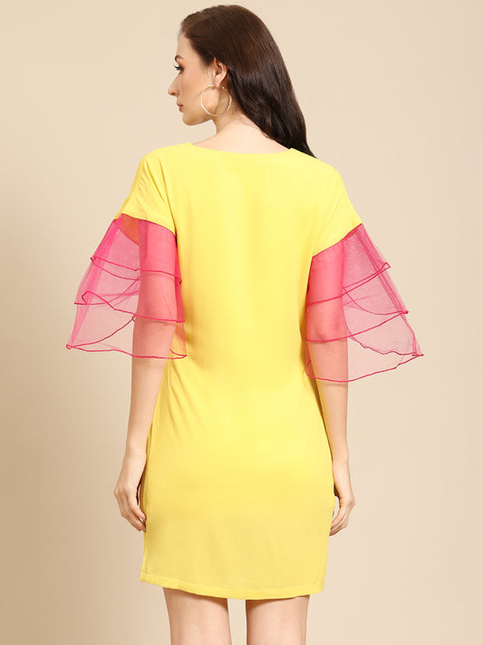 Stylish Yellow Dress with Sheer Pink Ruffle Sleeves – Trendy Summer Wear for Women