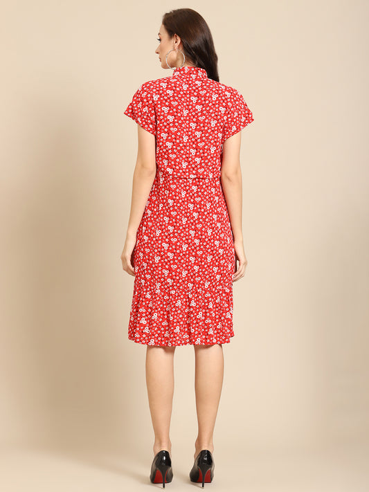 Red Floral Midi Dress for Women – High Neck Short Sleeve Summer Dress with Ruffle Hem