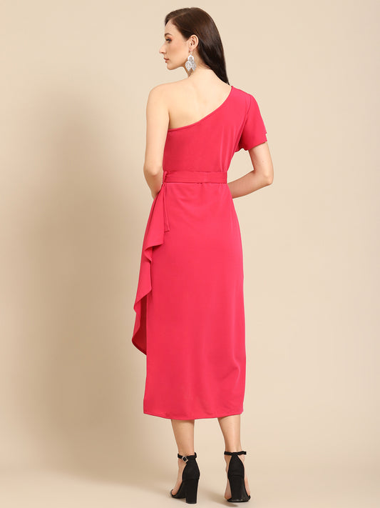 Elegant One-Shoulder Pink Midi Dress with Waist Tie – Perfect for Parties & Events