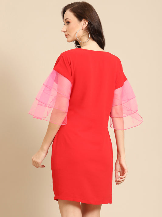 Red Mini Dress with Pink Organza Ruffle Sleeves – Bold & Trendy Party Outfit for Women