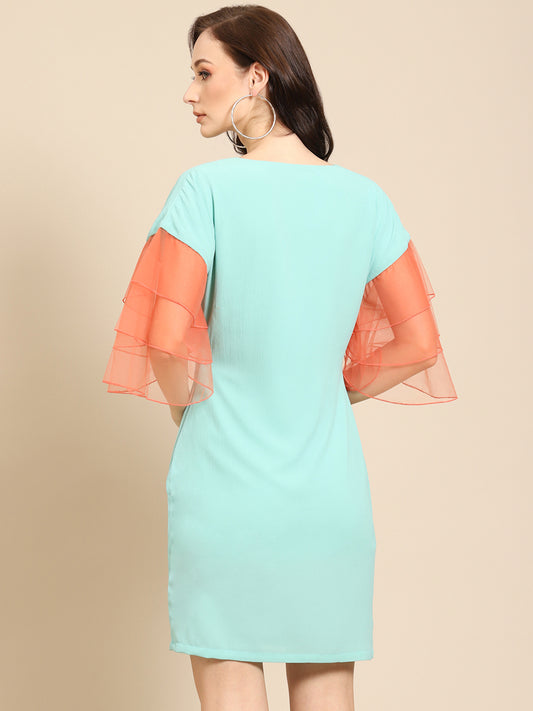 Mint Green Mini Dress with Orange Organza Ruffle Sleeves – Trendy Casual & Party Wear for Women