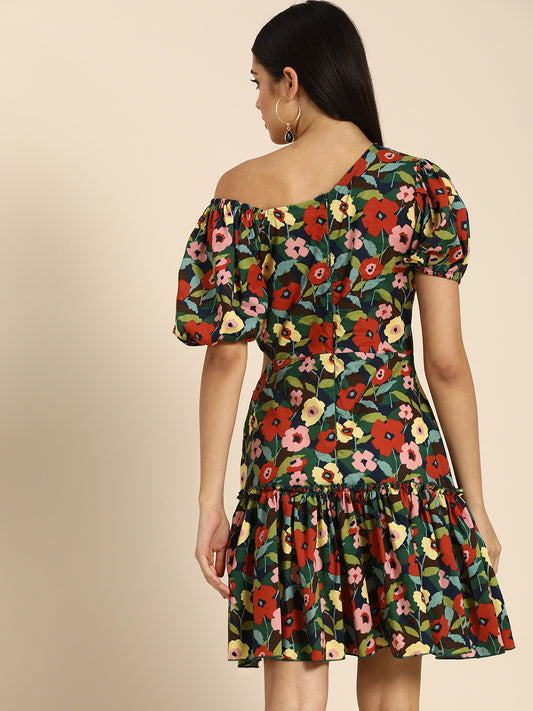 Multicolor One Shoulder Floral Print Mini Dress with Puff Sleeves
