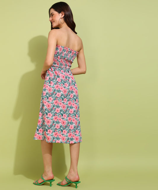 Women's Pink Floral Strapless Smocked Midi Dress β Summer Beachwear
