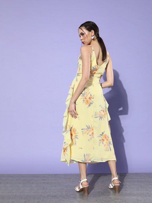 Pastel Yellow Floral Ruffle Midi Dress Elegant Summer Vibes
